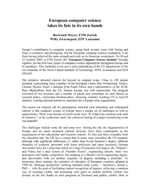 On 20 and 21 October 2005, at ETH Zurich, the “European Computer Science Summit” brought together, for the first time, heads of computer science departments throughout Europe and its periphery. The initiative attracted interest far beyond its original scope. Close to 100 people attended, representing most countries of the European Union, plus Switzerland, Turkey, Ukraine, Russia, Israel, a delegate from South Africa, and a representative of the ACM from the US. Eastern Europe was well represented. The program consisted of two keynotes and a number of panels and workshops on such themes as research policy, curriculum harmonization, attracting students, teaching CS to non-CS students, existing national initiatives, and plans for a Europe-wide organisation.