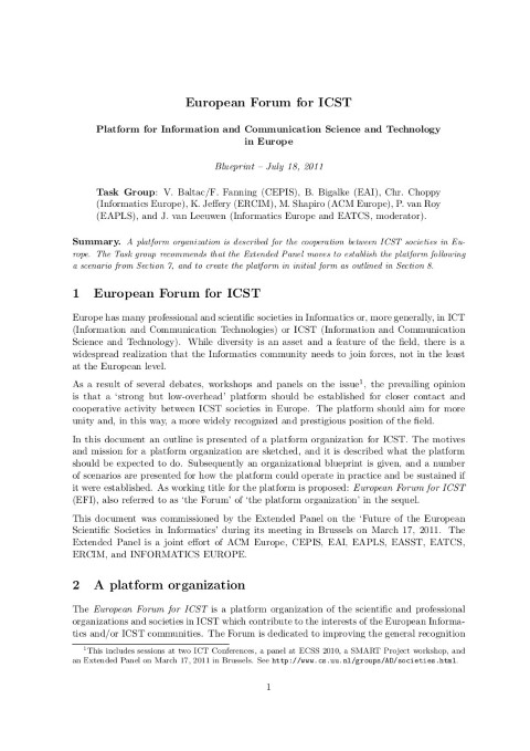 At the ECSS 2010 in Prague a panel with representatives from ACM Europe, CEPIS, EAI, ERCIM, EAPLS, EATCS and Informatics Europe convened to discuss the current situation and future prospects of the European scientific societies in Informatics. In March 2011 an extended panel reconvened to discuss the options for an actual format for the cooperative activity among ICST societies and for possible concrete steps towards the creation of a platform for collaboration. A task group was formed to study and develop a blueprint for an "open" platform organization for closer contact and cooperation among these societies in Europe.