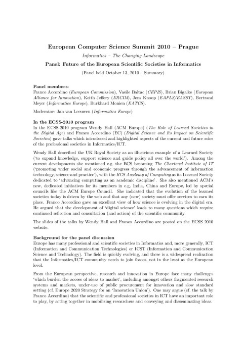 As a step towards this goal, the European Computer Science Summit 2010 in Prague included a special panel to assess the current situation of the scientific societies, with their strengths and weaknesses, and to examine their possible future evolution in ‘the changing landscape'.