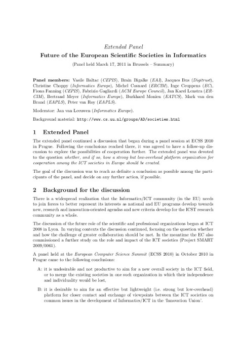This document was commissioned by the Extended Panel on the ‘Future of the European Scientific Societies in Informatics’ during its meeting in Brussels on March 17, 2011. The Extended Panel is a joint effort of ACM Europe, CEPIS, EAI, EAPLS, EASST, EATCS, ERCIM, and Informatics Europe.